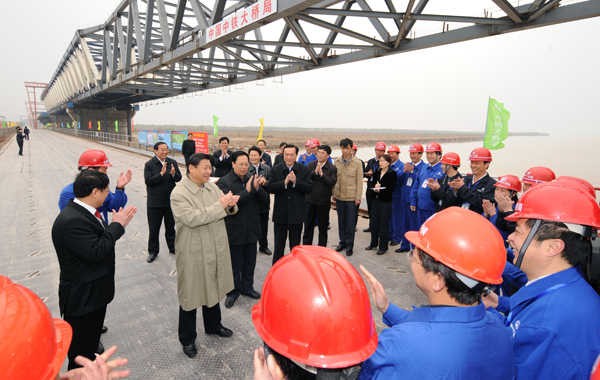 2009年4月2日,中共中央政治局常委、国家副主席习近平到郑州黄河公铁两用大桥工地视察。