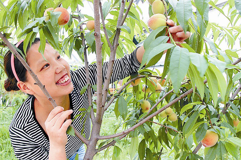 “三工”建设的重要事情来抓,在生活区种植了桃树、桂花树等。目前,1.2万平方米的生活区绿树成荫,每棵桃树结满了桃子,已成为工地的一大景观。员工们不出项目部即可赏花,品尝到自己种的新鲜桃子。图为5月22日,项目部员工在桃园采摘桃子。