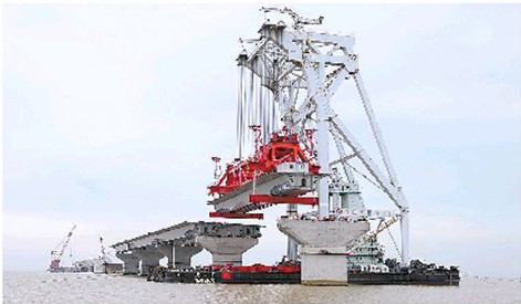 图为“天一号”3000吨运架梁起重船正在架设港珠澳大桥第33片组合梁。