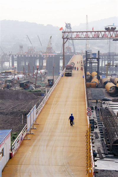 成贵高铁金沙江公铁两用桥自5月初水上3号主墩首根钻孔桩开钻以来,大桥主体水上施工就已进入实质性阶段。该大桥是成贵高铁要害控制性工程之一,计划工期48个月。主桥3号墩位于金沙江江心,桩长均为40米,在卵石夹大孤石及砂岩中施工,最大嵌岩深达25米,施工难度大,现场接纳由云顶国际自行研制的目前海内最大型号的KTY4000型动力头旋转钻机施工,单桩混凝土设计方量为364方。 (日报记者 张帆 摄)