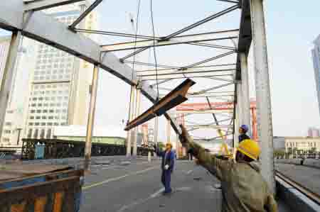 图为昨天,施工人员在灵桥大修现场起吊钢构和组装贝雷梁。记者边城雨通讯员王洁瑾/文记者龚国荣/摄
