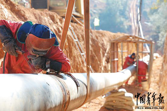 昆明市西山区团结乡阿苦力村一处工地,工人正在焊接管道。