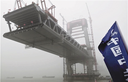 这是乐成封顶后的商合杭铁路芜湖长江公铁大桥北主塔(11月30日摄)。